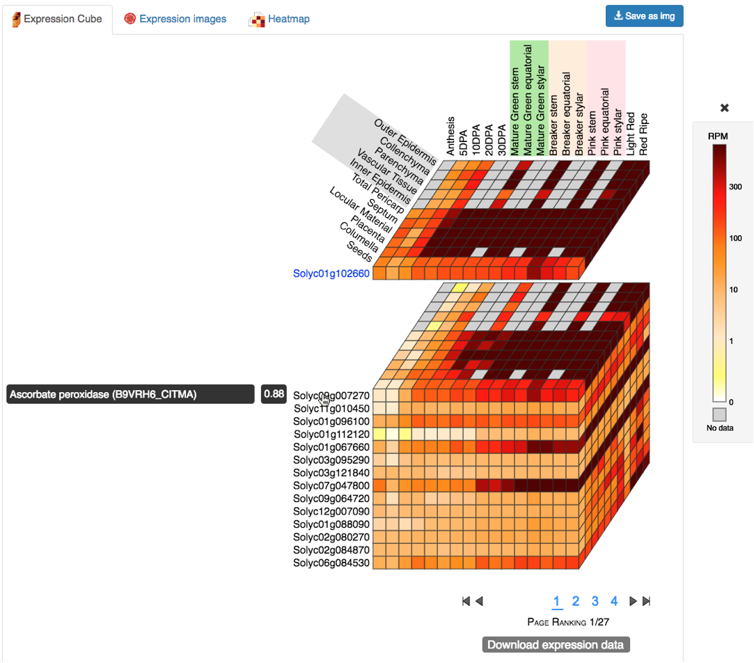 The second tab on the expression viewer output shows the expression values from the query gene in their anatomical and developmental context, using a color scale to display the expression on drawings that represent the stages and tissues from the tomato fruit (Figure 6). These drawings are directly traced from photographs and microscope images (See the anatomy viewer for more information). Moving the mouse over the images will show a popup window with the RPM expression value for each of the tissues/cell types.